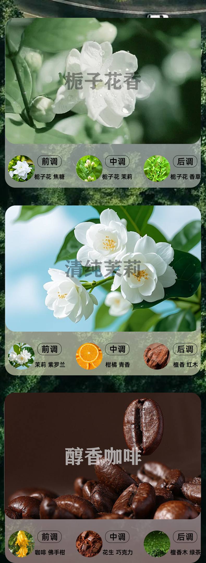 Nóta barr (gardenia caramal) nóta meánach (gardenia jasmine) bunnóta (gardenia vanilla)